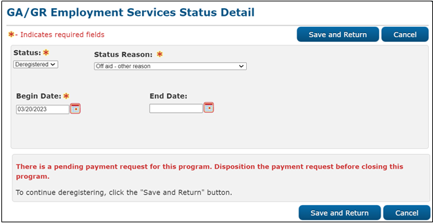 - Attachment: ScreenshotScreenshot of the GA/GR Employment Services Status Detail page with the alert indicating that there is a pending payment request